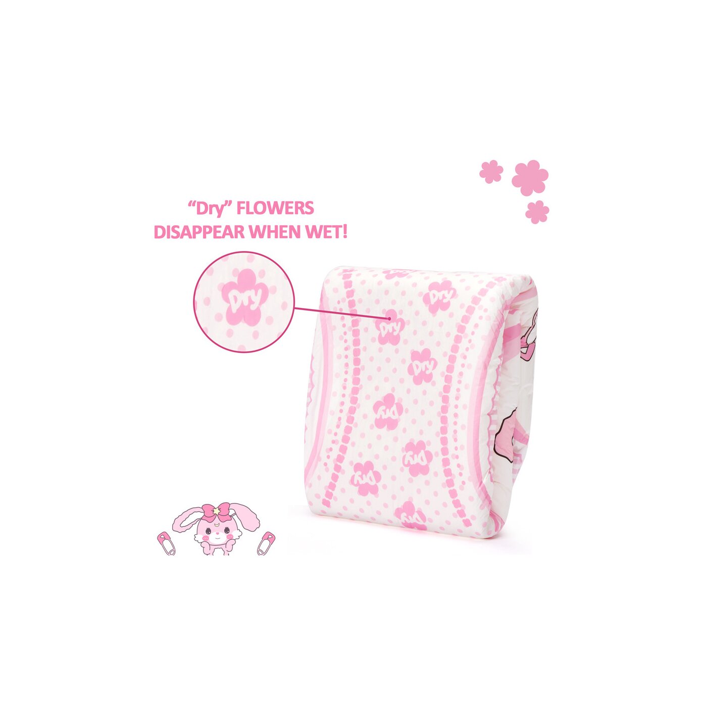 Ein besonderes Extra: „Dry“-Blumen auf der Vorder- und Rückseite verschwinden, sobald die Windel nass wird – für eine realistische Nässeanzeige! 🌸