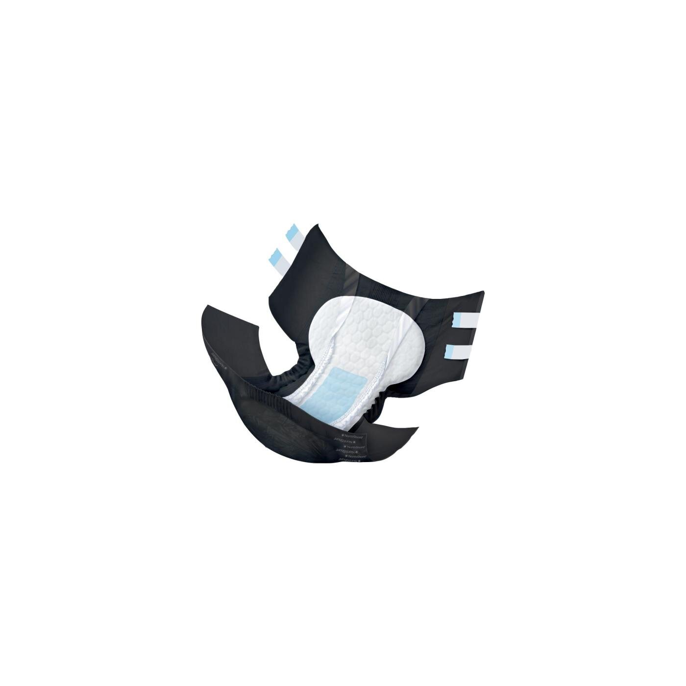 Die strapazierfähigen, wiederverschließbaren Klebelaschen mit voller Landezone garantieren einen sicheren und bequemen Sitz. Das glatte, robuste Folienmaterial in Schwarz verhindert Durchhängen und Geruchsbildung und sorgt gleichzeitig für eine unauffällige, elegante Optik. Elastische Bündchen an Taille und Beinen bieten zusätzlichen Schutz vor Auslaufen.