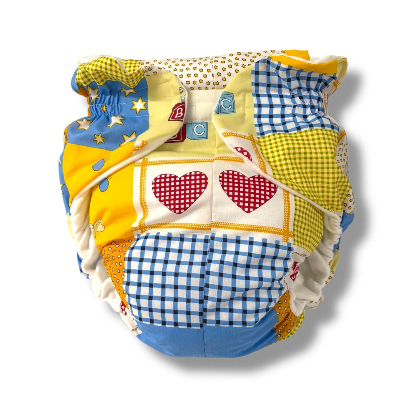Mit der Omutsu „Bauklötzchen & Herzen“ holst du dir verspielte Nostalgie und Geborgenheit direkt an deinen Po. Diese liebevoll gestaltete Stoffwindelhose kombiniert fröhliche Kinderstoffe mit Herzchen, Sternen, Karos und Bauklötzchen zu einem Patchwork-Design, das zum Träumen einlädt.