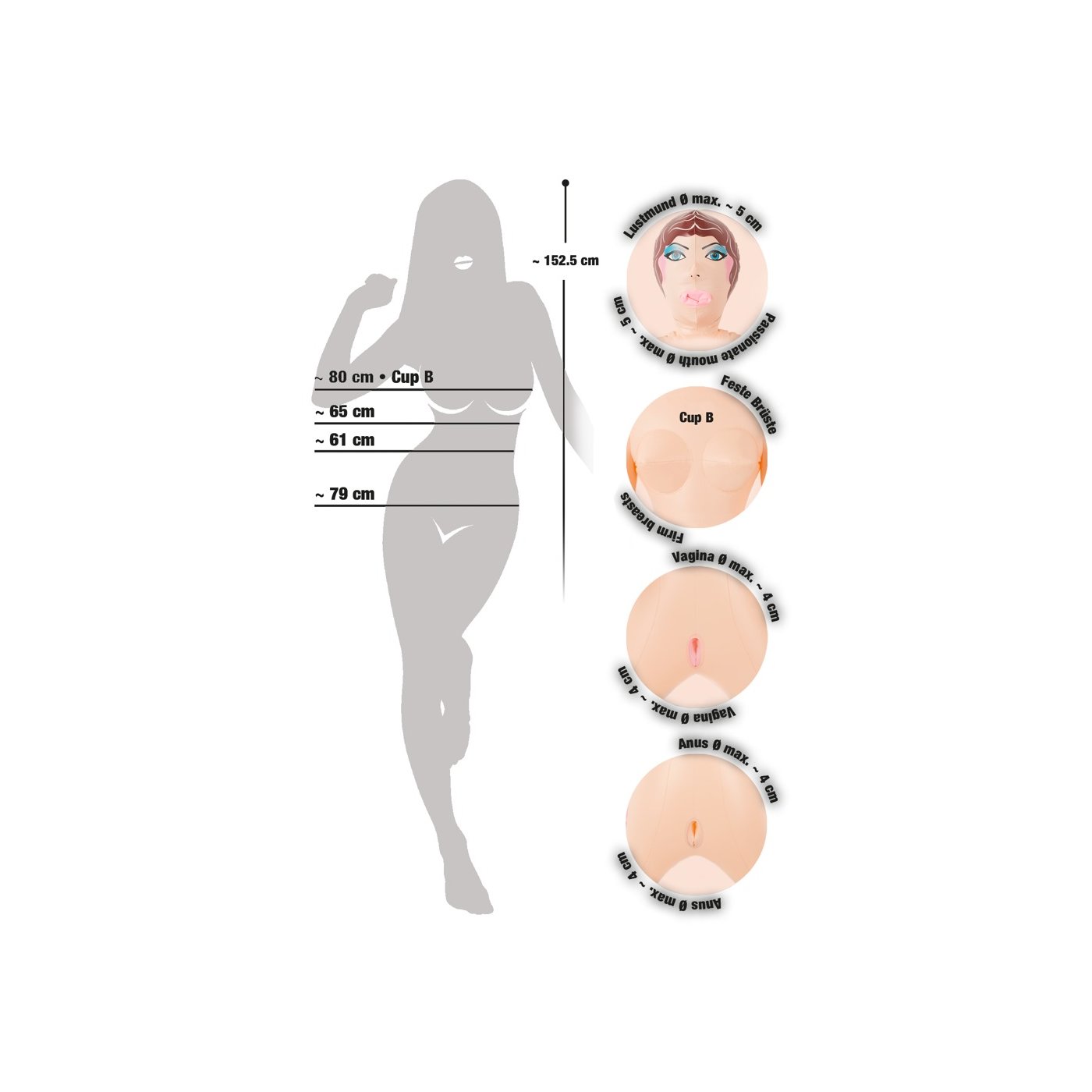 Gesamtlänge 152 cm, Einführtiefe Vagina 11 cm, Einführtiefe Anus 13 cm, Einführtiefe Mund 11,5 cm. PVC.
