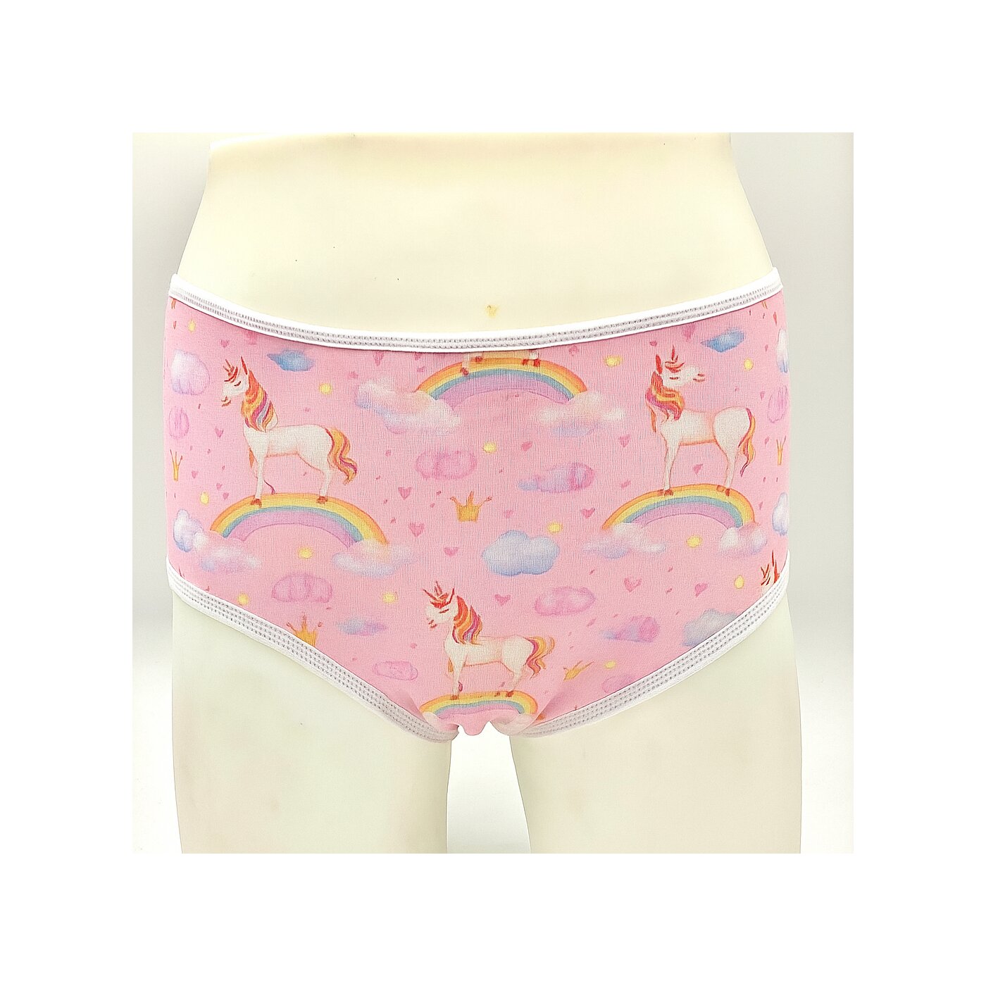 The Cloud Pony Brief brings fairy-tale softness into your everyday life. 🦄☁️🌈 Lovingly handmade from soft cotton jersey, this adorable brief features a whimsical all-over print: proud unicorns with rainbow manes prancing atop pastel rainbows, surrounded by fluffy clouds, golden crowns, and tiny hearts.